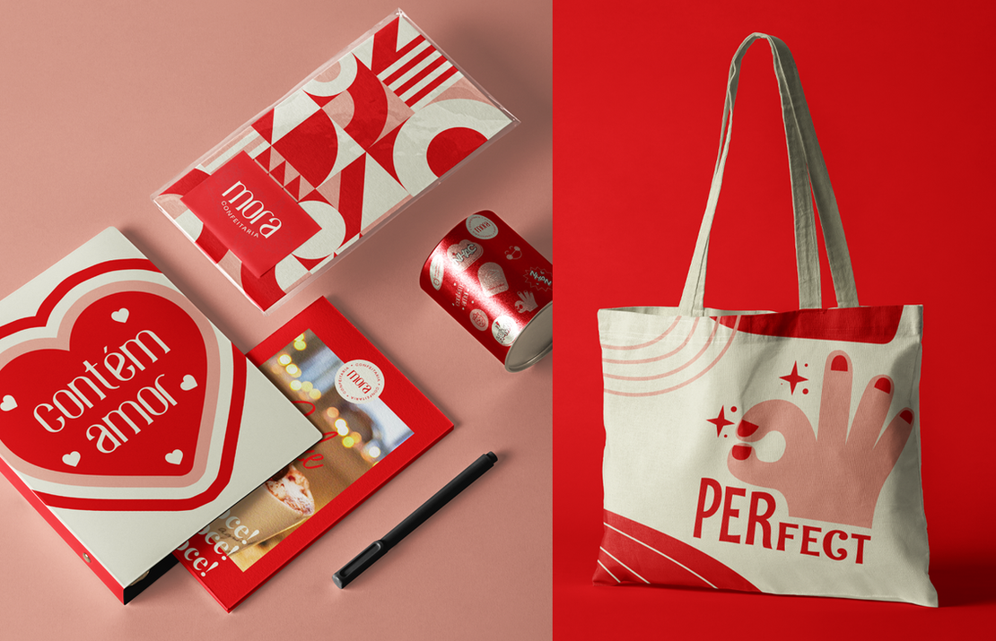 A Mora Confeitaria é uma empresa nova de bolos modernos em buttercream. Ela explora cores, texturas e design em seus bolos, tornando seu produto único e moderno para cada cliente. Esses ingredientes tão singulares foram explorados para a criação de cada detalhe da identidade visual da marca. A tipografia principal reforça a pegada mais jovial, se conectando fortemente com o público alvo. A Paleta de cor foi selecionada à partir das cores da amora, que podem variar de branco, vermelha, roxa ou negra. Escolhemos o vermelho e o bege claro que dão um contraste harmônico, buscando sofisticação sem perder o apelo moderno e jovial. O roxo/preto não foram selecionados por serem cores muito comuns em marcas associadas a fruta amora. Fugindo do óbvio, incluímos o rosa para transmitir leveza